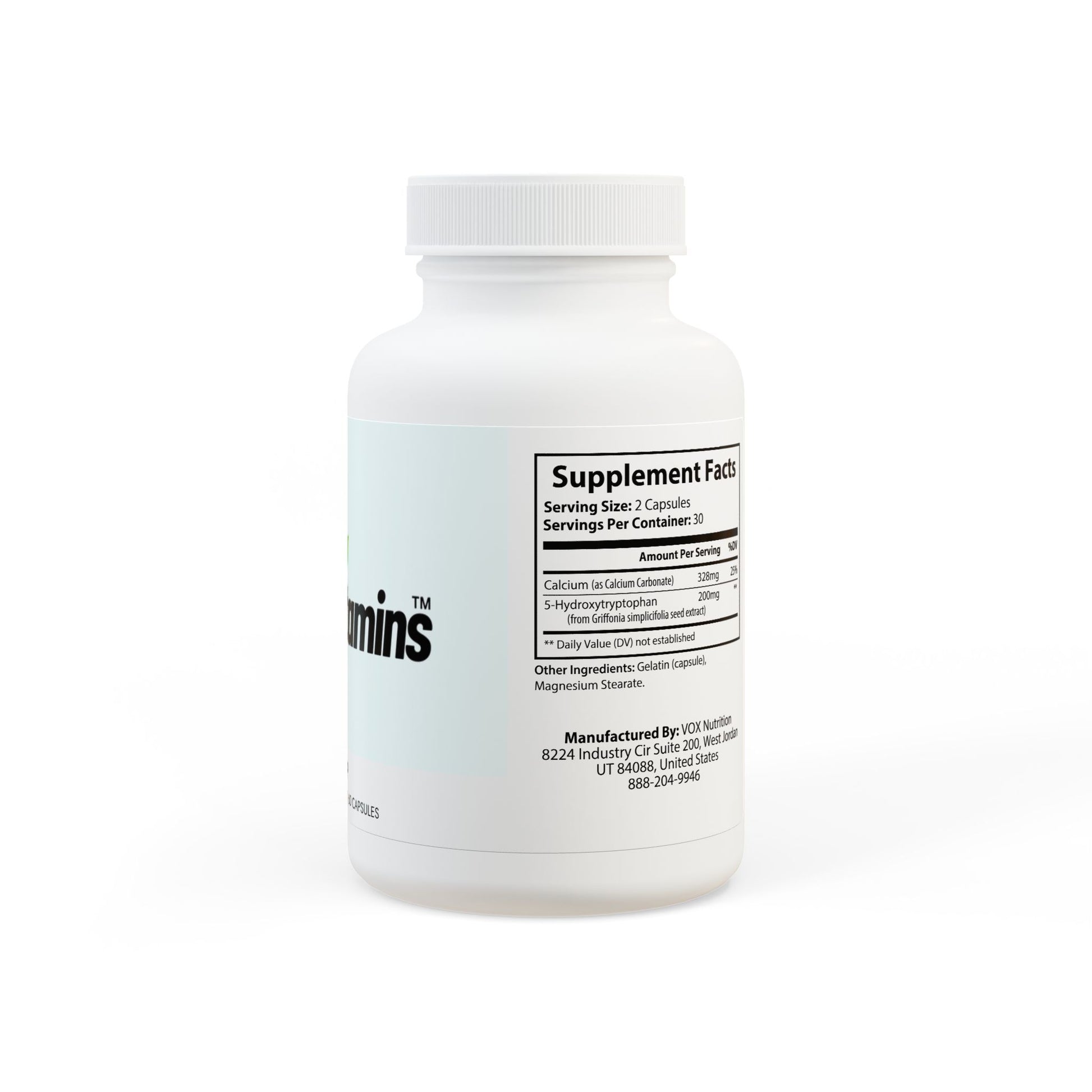 Ingredients: Calcium (as Calcium Carbonate), 5-Hydroxytryptophan (from Griffonia simplicifolia seed extract). Other Ingredients: Gelatin (capsule), Magnesium Stearate.