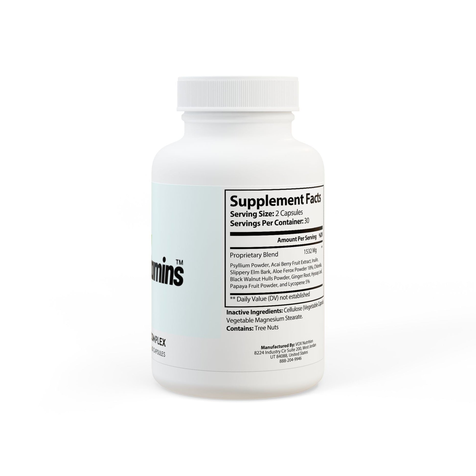 Ingredients: Psyllium Powder, Acai Berry Fruit Extract, Inulin, Slippery Elm Bark, Aloe Ferox Powder 18%, Chlorella, Black Walnut Hulls Powder, Ginger Root, Hyssop Leaf, Papaya Fruit Powder, and Lycopene 5%. Inactive Ingredients: Cellulose (Vegetable Capsule), Vegetable Magnesium Stearate. Contains: Tree Nuts