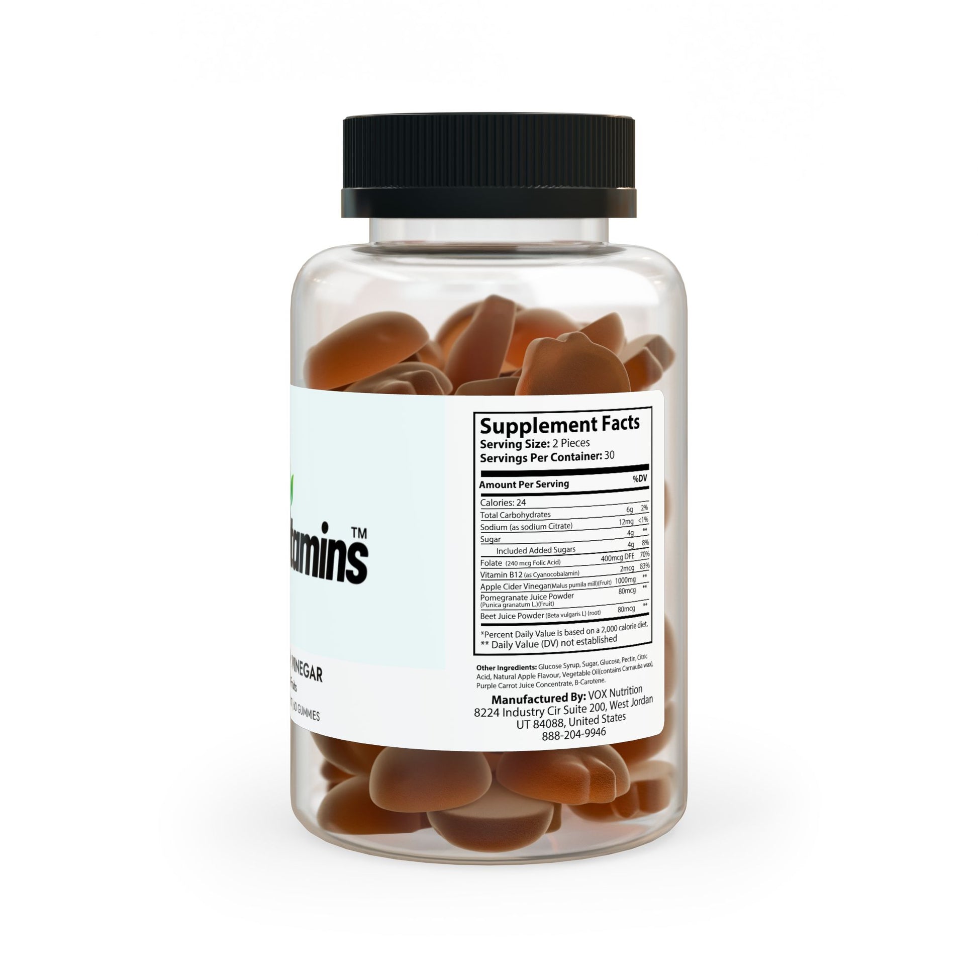 Ingredients: Sodium (as sodium Citrate), Sugar, Folate (240 mcg Folic Acid), Vitamin B12 (as Cyanocobalamin), Apple Cider Vinegar(Malus pumila mill)(Fruit), Pomegranate Juice Powder (Punica granatum L.)(Fruit), Beet Juice Powder (Beta vulgaris L) (root). Other Ingredients: Glucose Syrup, Sugar, Glucose,Pectin, Citric Acid, Natural Apple Flavour, Vegetable Oil(contains Carnauba wax), Purple Carrot Juice Concentrate, B-Carotene.