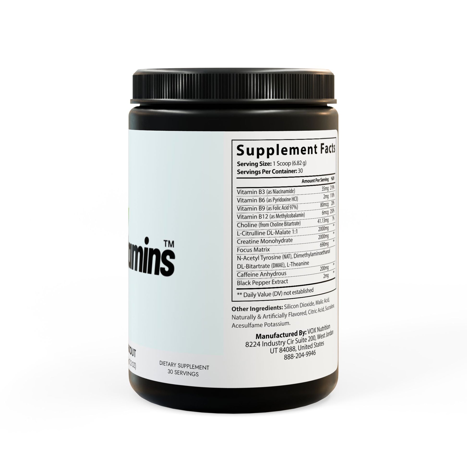 Ingredients: Vitamin B3 (as Niacinamide), Vitamin B6 (as Pyridoxine HCl), Vitamin B9 (as Folic Acid 97%), Vitamin B12 (as Methylcobalamin), Choline (from Choline Bitartrate), L-Citrulline DL-Malate 1:1, Creatine Monohydrate, N-Acetyl Tyrosine (NAT), Dimethylaminoethanol, DL-Bitartrate (DMAE), L-Theanine, Caeine Anhydrous, Black Pepper Extract. Other Ingredients: Silicon Dioxide, Malic Acid, Naturally & Articially Flavored, Citric Acid, Sucralose, Acesulfame Potassium.