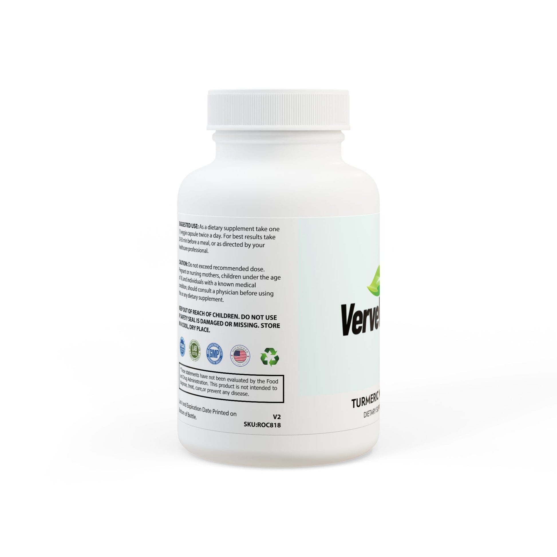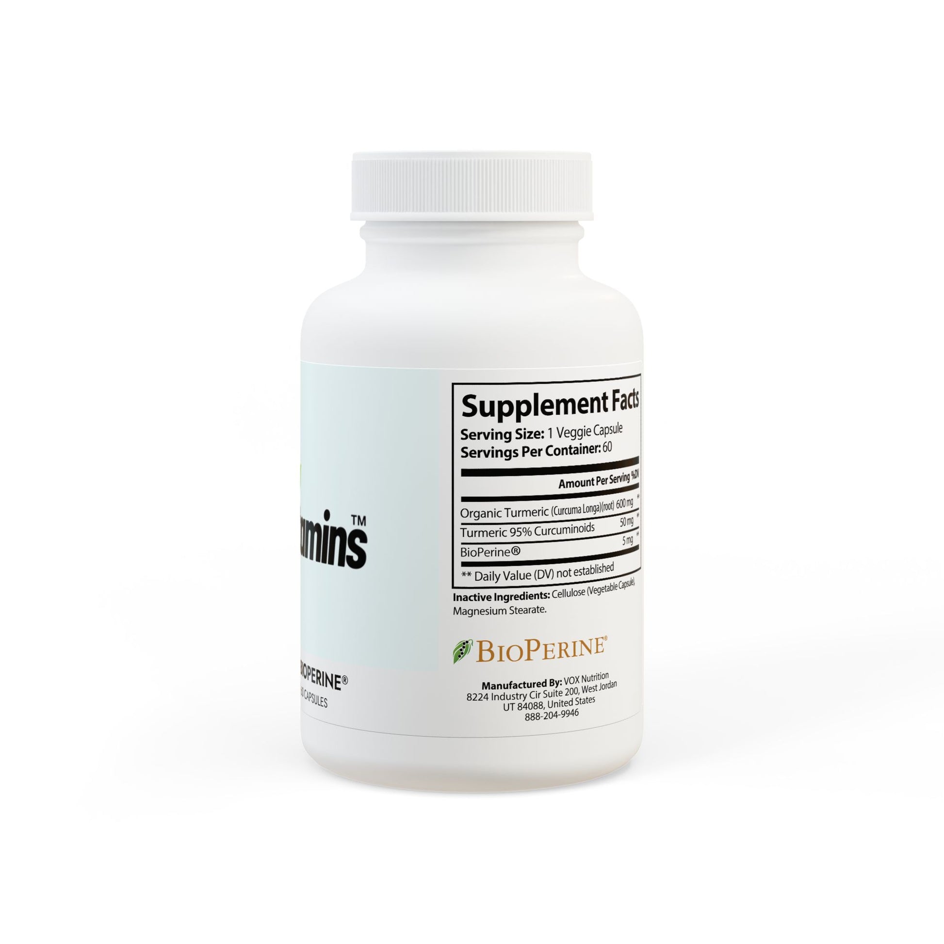 Ingredients: Organic Turmeric (Curcuma Longa)(root), Turmeric 95% Curcuminoids, BioPerine. Inactive Ingredients: Cellulose (Vegetable Capsule), Magnesium Stearate.